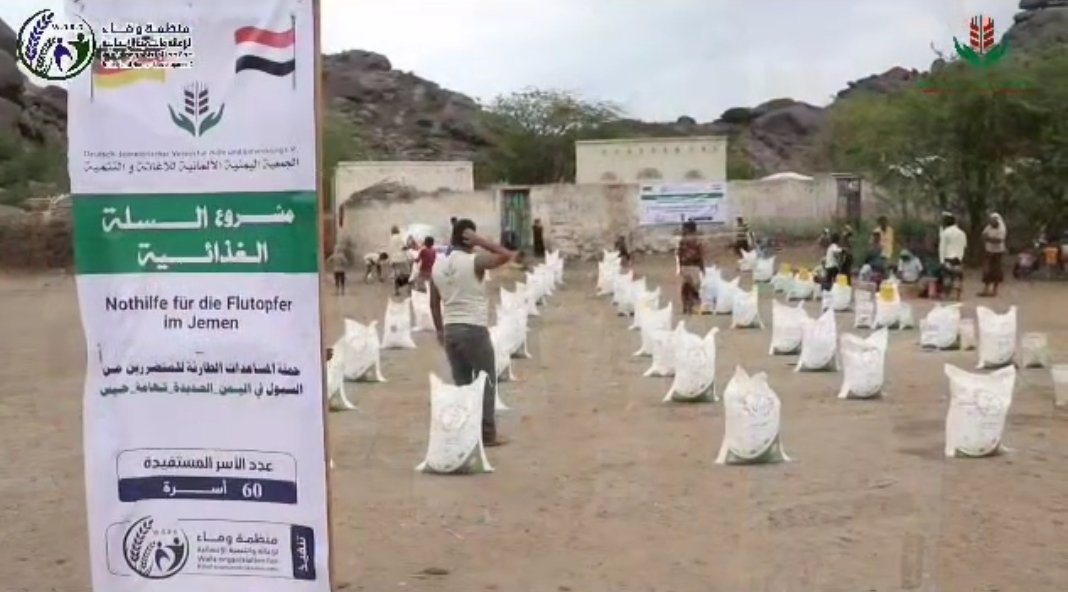 المرحلة الثانية من المساعدات الطارئة للمتضررين من السيول في الحديدة مديرية حيس وبتمويل كريم من Deutsch-Jemenitischer Verein für Hilfe und Entwicklung e.V. الجمعية اليمنية الالمانية يقوم فريق منظمة وفاء للاغاثة والتنمية الانسانية في يوم الاثنين 12/8 بتوزيع 60 سلة غذائية على الاسر المتضررة .
